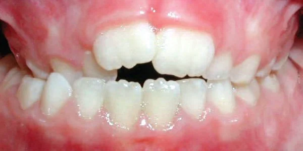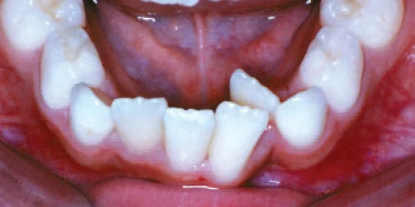 Lower teeth sit in front of upper teeth when back teeth are closed.